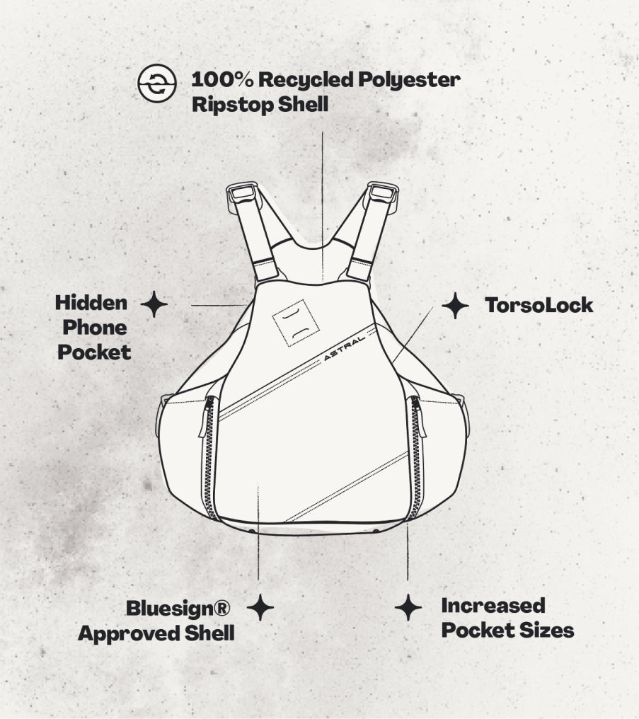Designed with the low profile Torso Lock™ foam platform, the YTV™ has cemented itself as a simple, clean, high mobility PFD. The YTV 2.0™ maintains the same architecture, while increasing its pocket size and adding a bluesign® approved, 100% recycled shell.